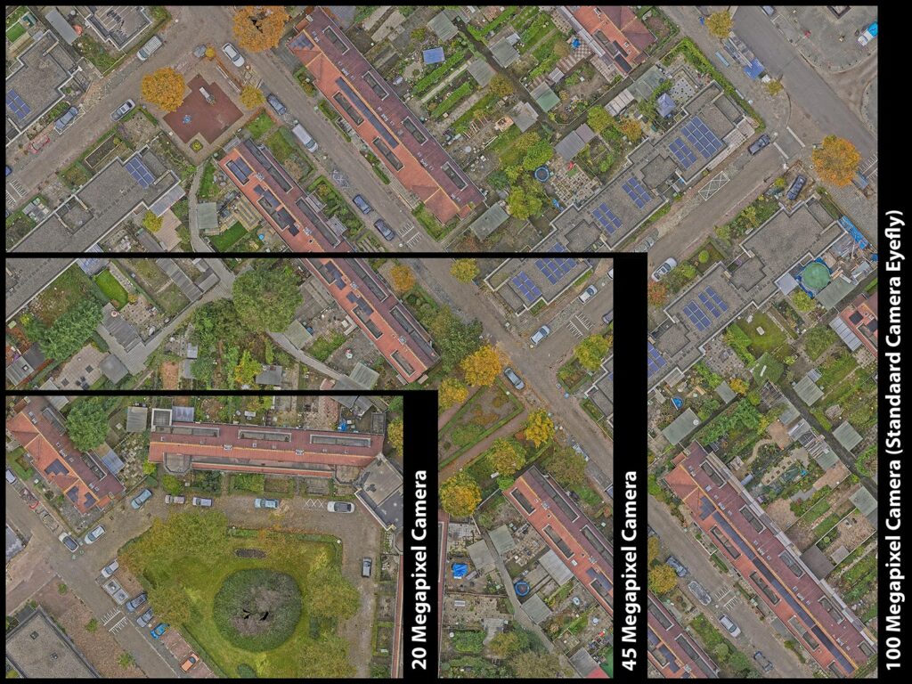 The image above shows how large the area is that is captured with a 20, 45 and 100 Megapixel camera. As shown, a 100 Megapixel camera captures a significantly larger area at once. This allows to work much more efficiently: fewer photos are needed to map a larger area, hence flying takes significantly less time.