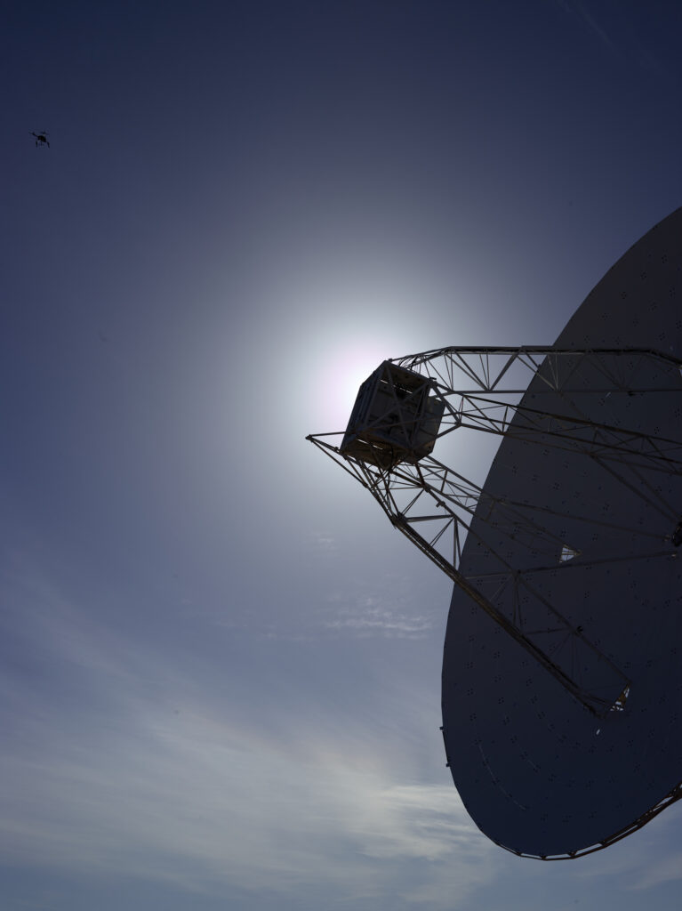 However, at 26 meters in diameter, the radio telescope dish is a large structure whose surface is not always visible from the ground as it moves through its various possible positions. With a cherry picker no longer being sufficient to provide measurement photos from very high positions, the university sought help from surveyors with experience of UAVs.